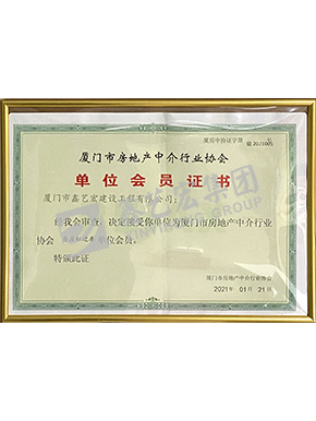 • 廈門(mén)市房地產(chǎn)中介行業(yè)協(xié)會(huì)單位會(huì)員證書(shū)